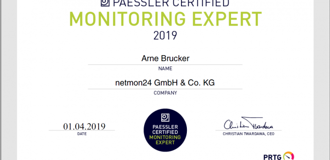 HERZLICHEN GLÜCKWUNSCH, Arne Brucker! Wir kannten ja schon vorher deine PRTG Skills, jetzt haben wir es sogar schwarz auf weiß und von Paessler AG zertifiziert. Unsere Kunden werden davon profitieren!